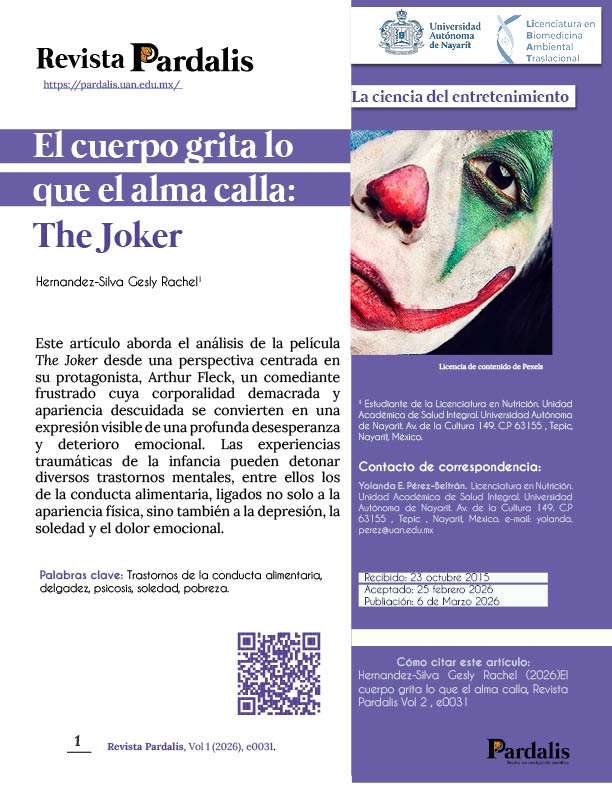 Este artículo aborda el análisis de la película The Joker desde una perspectiva centrada en su protagonista, Arthur Fleck, un comediante frustrado cuya corporalidad demacrada y apariencia descuidada se convierten en una expresión visible de una profunda desesperanza y deterioro emocional. Las experiencias traumáticas de la infancia pueden detonar diversos trastornos mentales, entre ellos los de la conducta alimentaria, ligados no solo a la apariencia física, sino también a la depresión, la soledad y el dolor emocional.